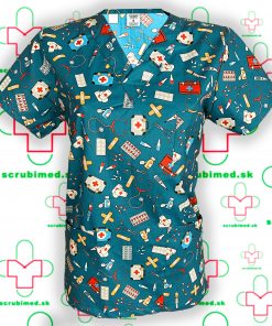 Originální zdravotnická košile vyrobena šikovnými Slovenské rukama. Vzorované oblečení obecně vytváří příjemnou atmosféru, která zlepší náladu vám, kolegům i pacientům.