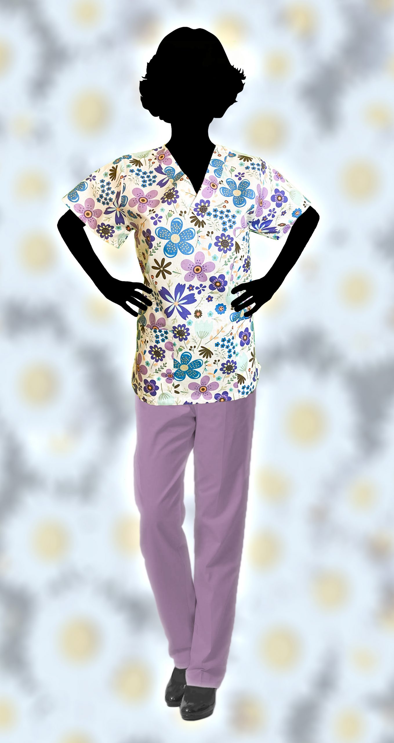 Schönes medizinisches Hemd mit einem Muster von Blumen. Wir empfehlen hellviolette Hosen zu tragen.