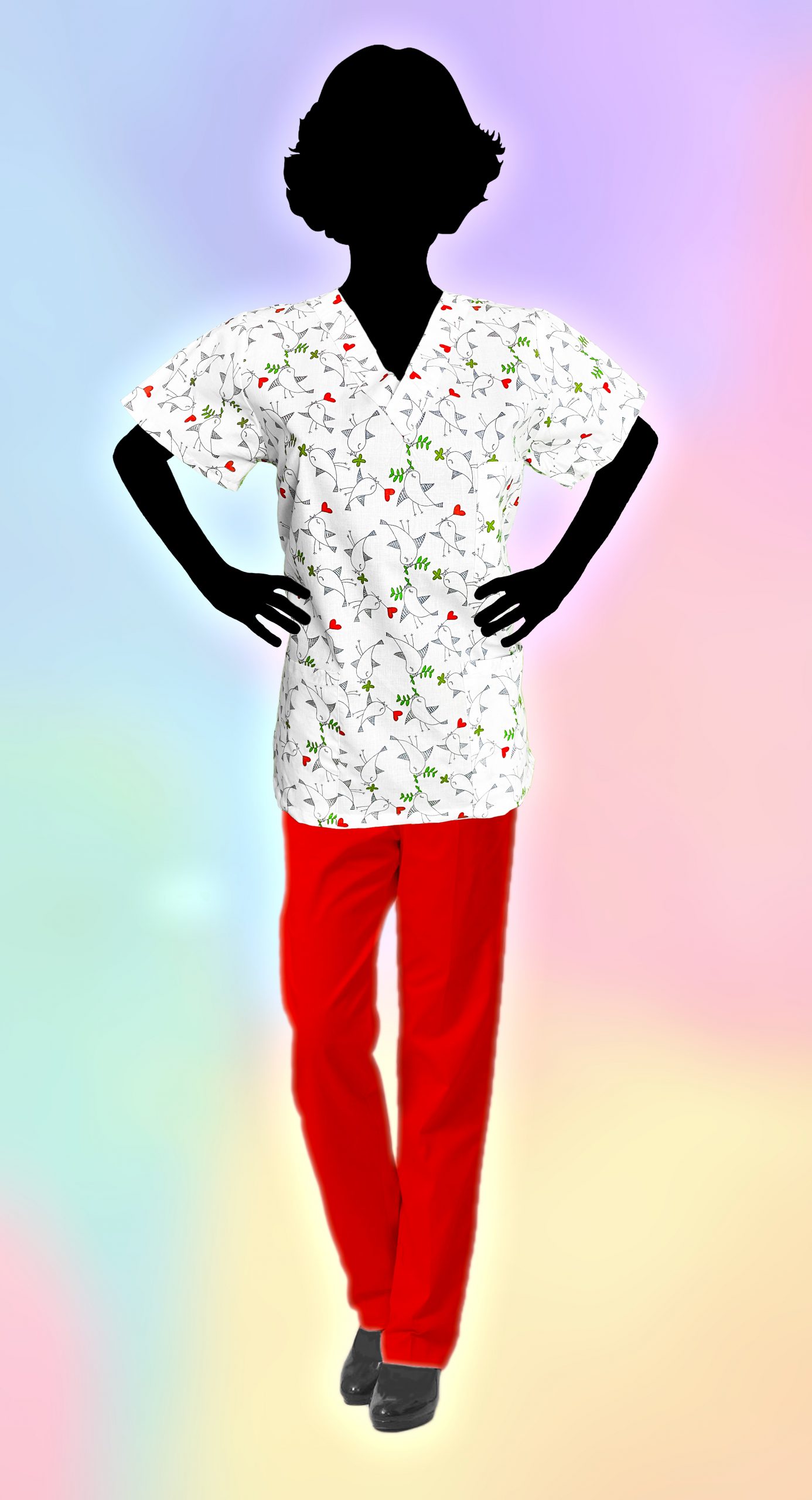 Elegantes medizinisches Hemd mit Vögeln. Möglichkeit, ein separates Shirt oder ein praktisches Set zu bestellen.